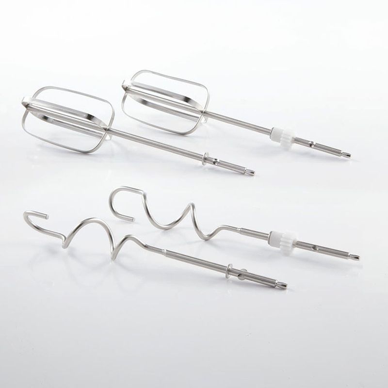 La batidora combina la posibilidad de trabajar con líquidos y también ingredientes pesados como masas gracias a sus accesorios de batidores y ganchos amasadores hechos en acero inoxidable que además son aptos para lavavajillas.