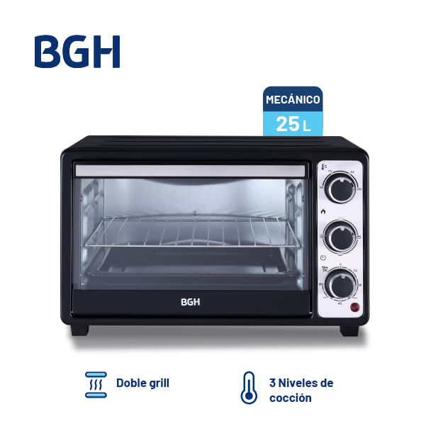 Cuenta con tres guías laterales para mayor versatilidad al colocar las bandejas, cuatro elementos calefactores (dos superiores y dos inferiores) para distribuir el calor de manera uniforme y patas antideslizantes para una estabilidad óptima.