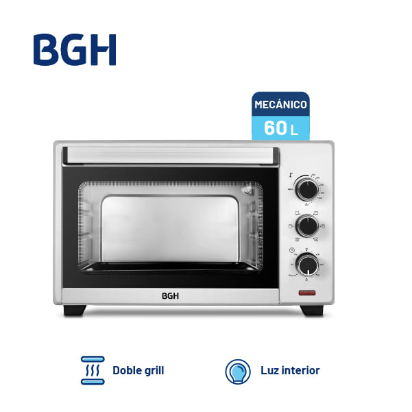 El BGH BHE60S22 es un horno eléctrico con un diseño moderno y funcional en color Silver. Cuenta con una puerta de vidrio amplia y comandos de control accesibles. Su capacidad es de 60 litros.