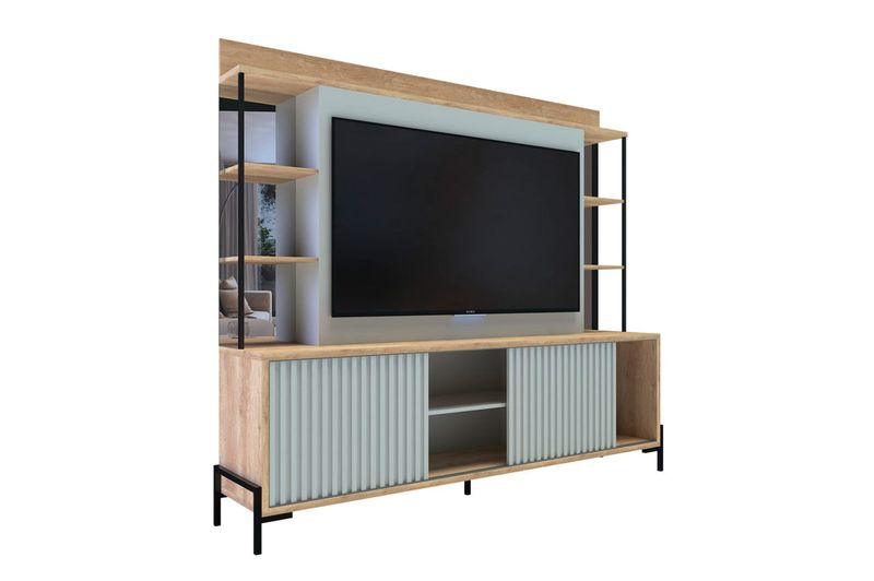 Modular varillado para tv hasta 60?. 2 puertas corredizas, estantes y detalle con espejos. Patas y perfiles de hierro negro con pintura epoxi.