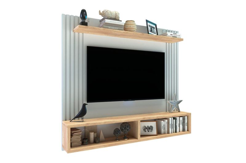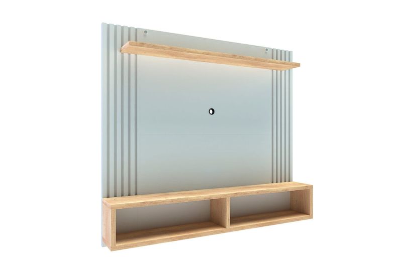 Panel varillado con 2 nichos y estante. Para TV de 43?. Fabricado con varillas de 15x25mm en MDF, placa MDP en 15 y 25 mm de espesor. Incluye herrajes para colgar terminación cromada. Melamina texturada de alta calidad.