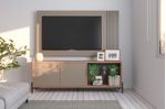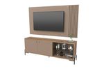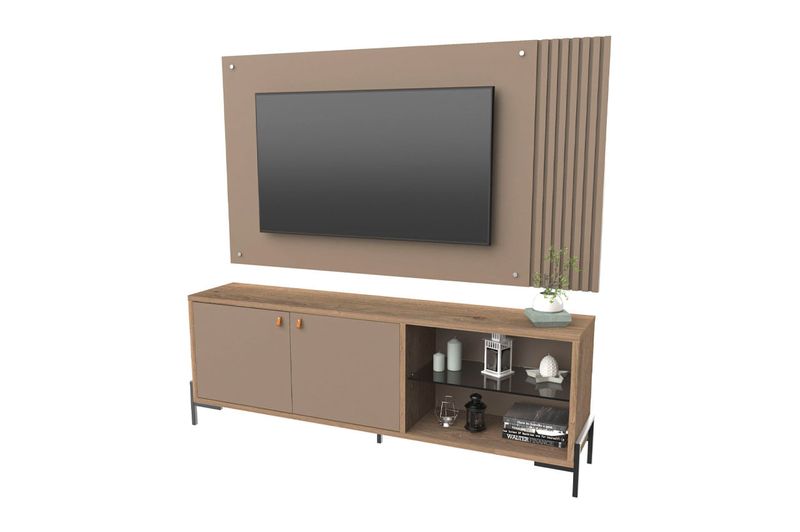 Rack varillado 2 puertas y un estante de vidrio con panel. Tiradores de cuero, patas de hierro con pintura epoxi. Incluye herrajes para colgar con terminación cromada. Para TV de 65?. Fabricado con varillas de 15x25mm en MDF, placa MDP en 15 y 25 mm de espesor. Melamina texturada de alta calidad. Embalaje con caja de cartón y termo contraíble.