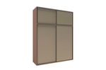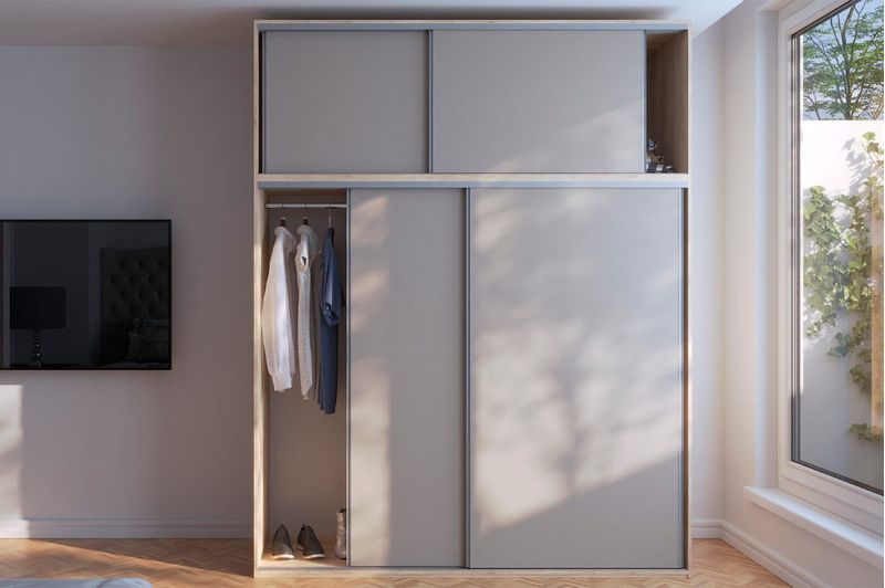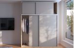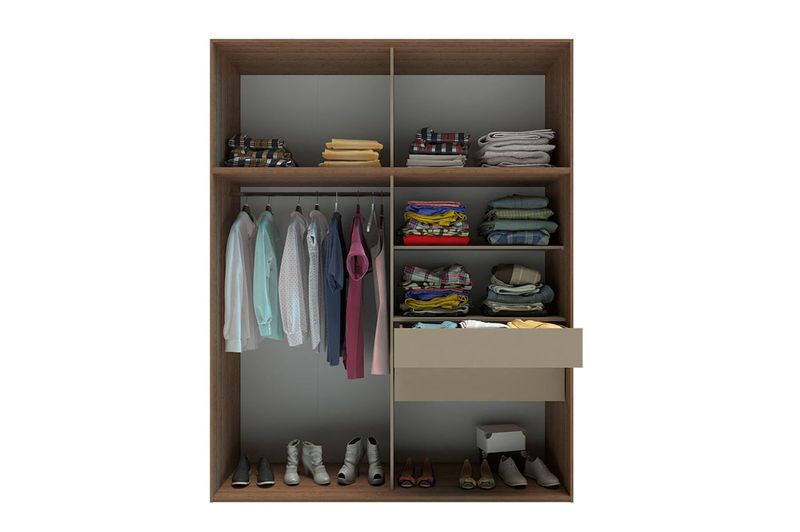 Ropero Dúo con baulera, 4 puertas corredizas. Baulera de 65cm de altura. 2 cajones internos con guías telescópicas. Manijon, guías y perchero de aluminio. Melamina de 15mm.